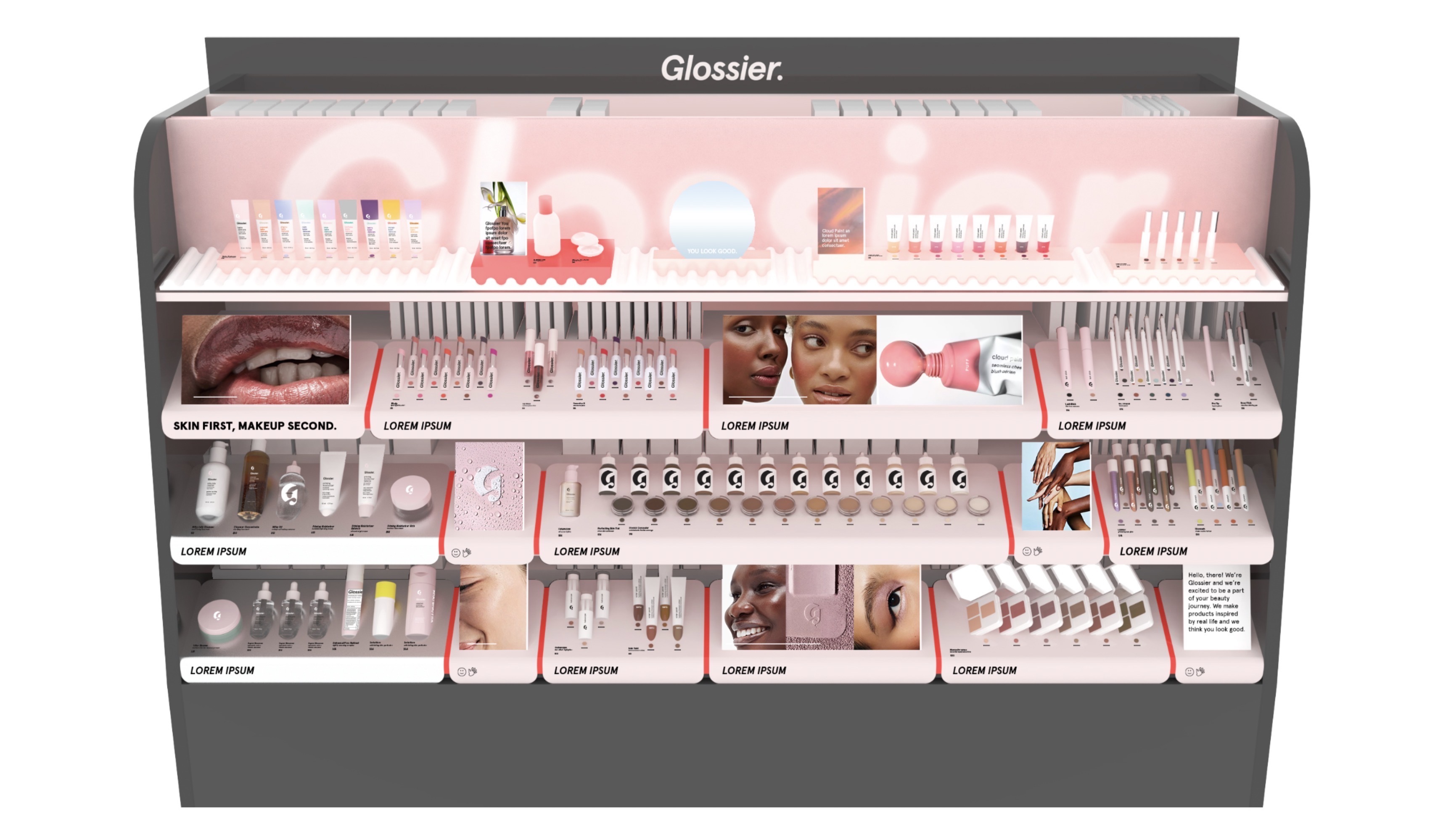 Shelf 3d design and renderings for Glossier’s first time ever in a wholesale environement– 900 Sephora stores in the US and Canada. The design challenge was to keep the integrity, sophistication, and materiality of Glossier’s iconic retail environments in a completely new setting.